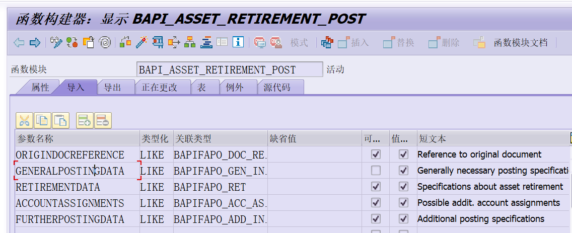 Description:The bapi corresponding to F-02 is BAPI_ACC_DOCUMENT_POST. This is the most commonly used bapi for generating certificates, but there are also standard transaction codes for asset retirement postings and the corresponding bapi (BAPI_ASSET_RETIREMENT_POST) in the SAP system. This article implements the F-02 correspondence BAPI for asset posting. To