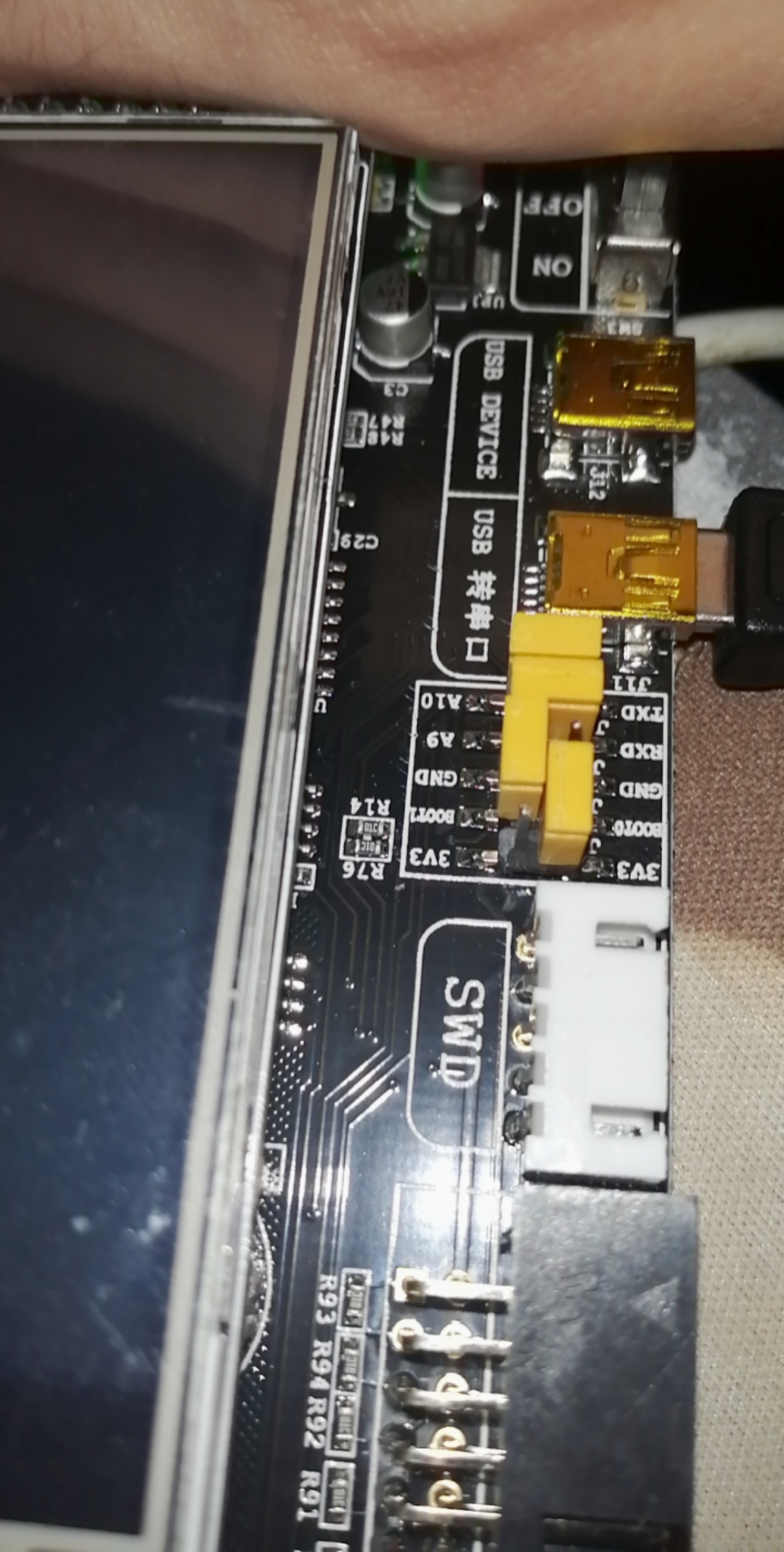 (2), re-enhancing the boot0 with 3V3, Boot1 is connected to GND, and the RXD is connected to A9, and the TXD is connected to the A10.