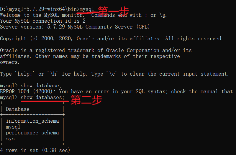 3. Re-open a CMD window, then find the installed address and only enter mysql