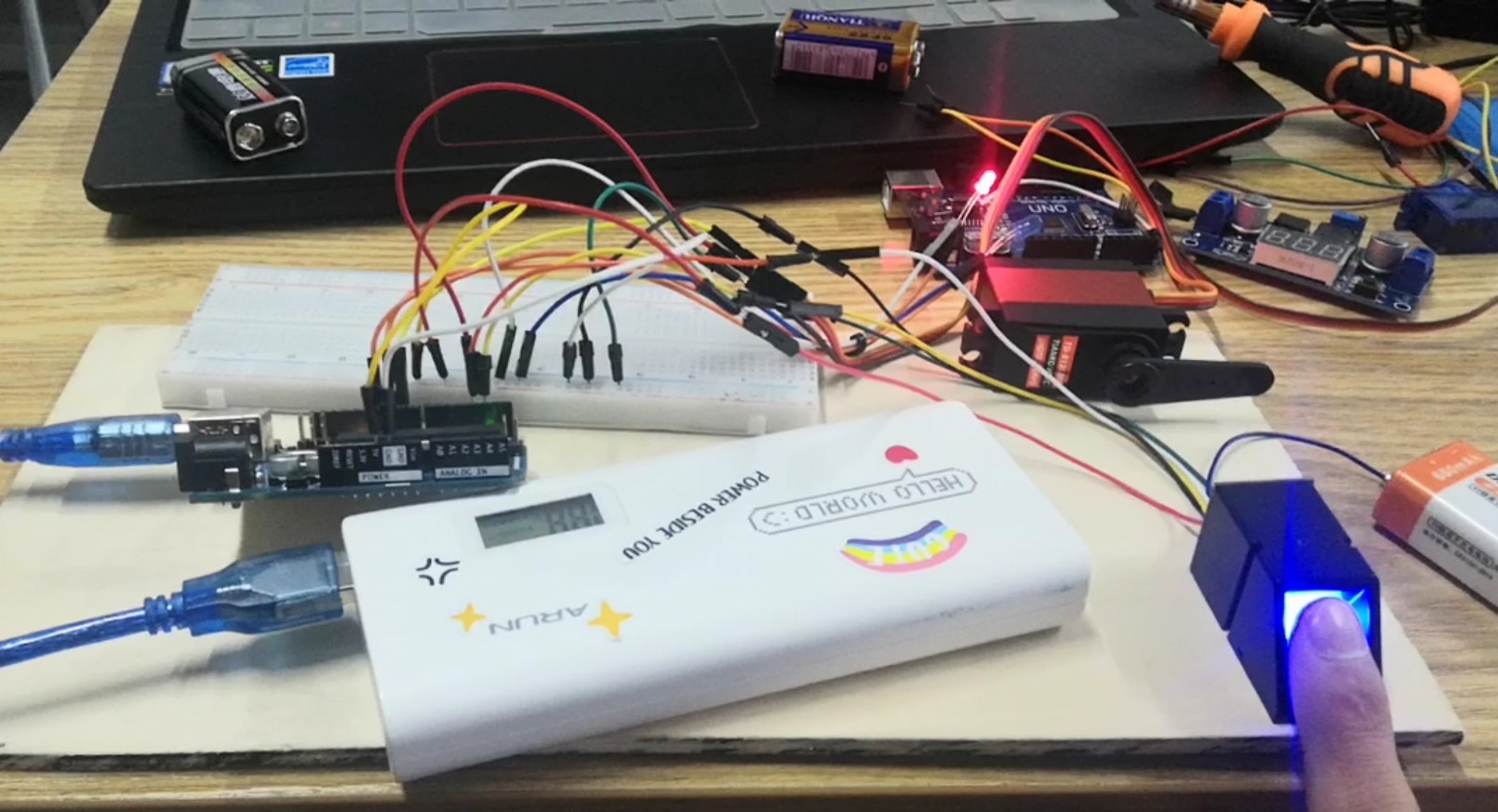 The fingerprint program in the library just mentioned is used here to make such a logical judgment. When the matching value reaches X, it will give the servo a signal and let it drive the bolt to rotate to simulate unlocking. So I transformed the library code and integrated the little knowledge about steering gear I learned before.