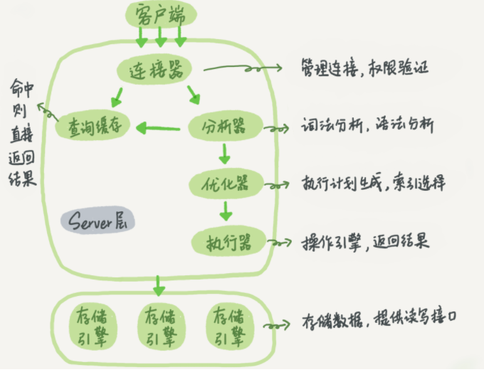 1, connect connection management module, receiving requests; connection process and user module, through, connection thread and client docking 2, query Query Cache Query Cache parser, built-in parse t...
