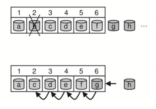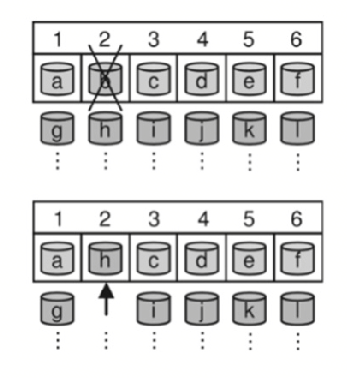 The virtual queue is realized by calculating the index value. To put it simply, for the firstn strategy, when the second device b (index value 2) fails, the second mirror position will re-point to the device with the index value of 2+1, that is, the rth mirror position will point to the index value It is a device of r+f, where f is the number of failed devices in the previous sequence. For the indep strategy, as shown in Figure 7-17, when the second device b fails, the second mirror position will point to the device h with an index value of 2+1×6, that is, the rth mirror position It will point to the device with the index value of r+f×n, where f is the device failure count and n is the total number of backups.
