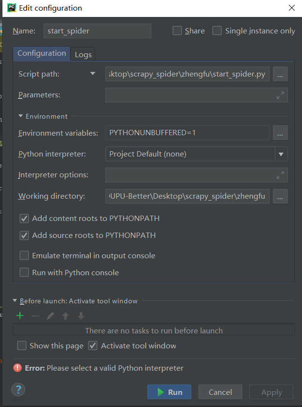 Run Configuration Error: Please specify script name