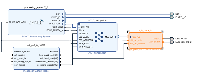 Create the axi-lite bus yourself, to led rgbled output interface Need 4+3*2=10 regs as output Specific IP core internal add pwm.v Instantiate, reg because pwm has a fine granularity of 256, reg only u...
