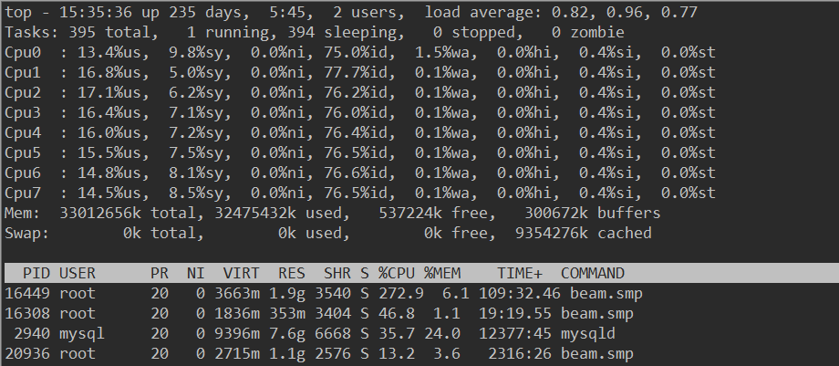 First look at the TOP command, you will find that the CPU(s) usage is only 15.5%, and a process %CPU reaches 278%.