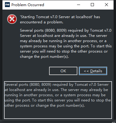 An error occurs when configuring Javaweb: Several ports (8005, 8080, 8009) required by Tomcat v7.0 Server at localhost are already in use. The server may already be running in another process, or a sy...