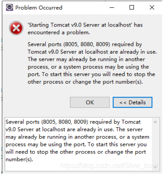Error when starting Tomcat server: Several ports (8005, 8080, 8009) required by Tomcat v9.0 Server at localhost are already in use… There may be the following: It may be that Eclipse is closed ...