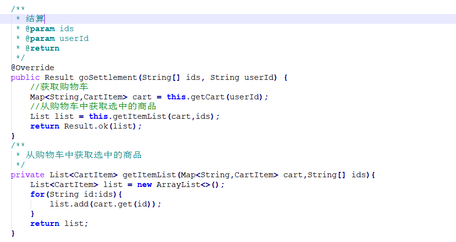 Fronted_cart achieve settlement service, the new method: to the settlement, the return value of the method: the Result parameter, method: String [] ids, String userId
