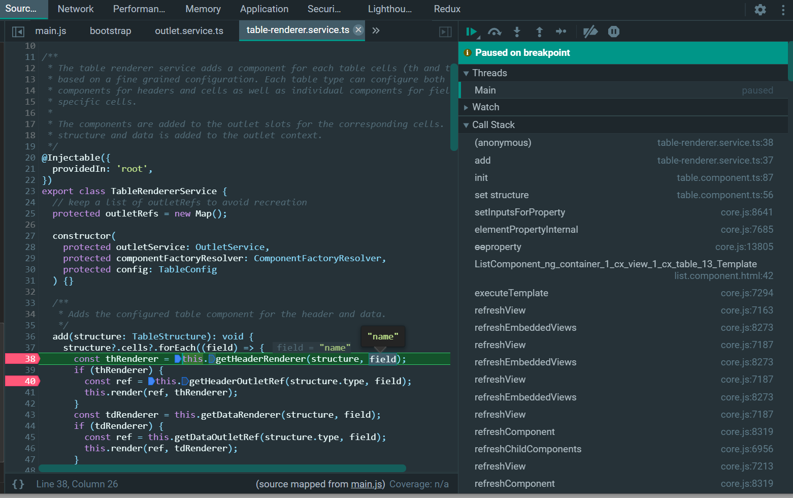 Take the following figure as an example. What is the Angular Component responsible for rendering the table column name? There is no field named headerComponent: So read from headerComponent in tableOp...