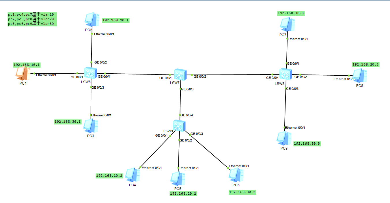 Because different VLANs cannot communicate, experiment with the communication between different VLANs through the configuration of the switch 1: Experimental topology put here pc1, pc4, pc7 all belong...