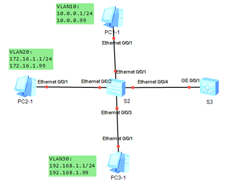 Experiment Topology: Experimental description: 1. Modify the switch name to S2 S3 2. Be properly configured on S2 S3 so that the three VLANs can communicate Experimental configuration: Test connectivi...