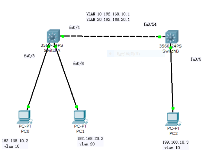 Problem analysis: Because this topology is a three-layer device. The access switches (sw2, sw3) are forwarding devices. You can regard vlan 10 as a PC as a whole, and similarly, vlan 20 is also a PC. So it can be simplified to a three-layer switch and two pc connections. Simplified can be regarded as a router and two pcs.
