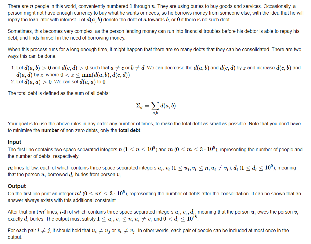 Topic: Given n n n Personal debt relationship, u , v , w u,v,w u,v,w Just v v v Owe u u u w w wFor a dollar, we know that the debt relationship can be transferred, so find all the debt relationships w...