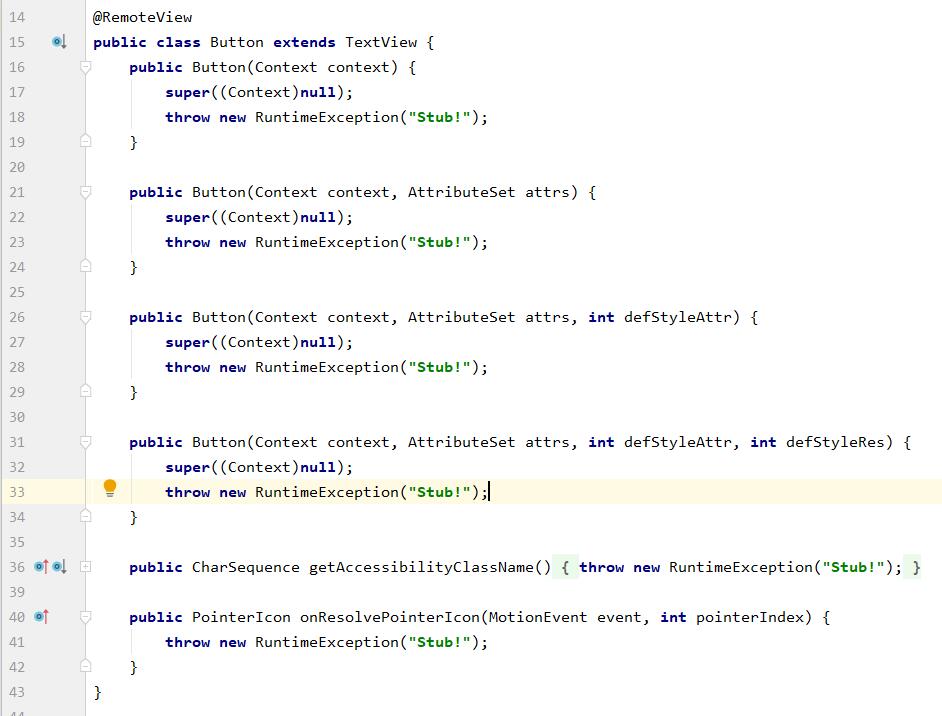Same as last time, first write a line of code and put the Button in the last LinearLayout Take a look at the commonly used functions in Button. Like TextView, it contains 4 constructors. We only need ...