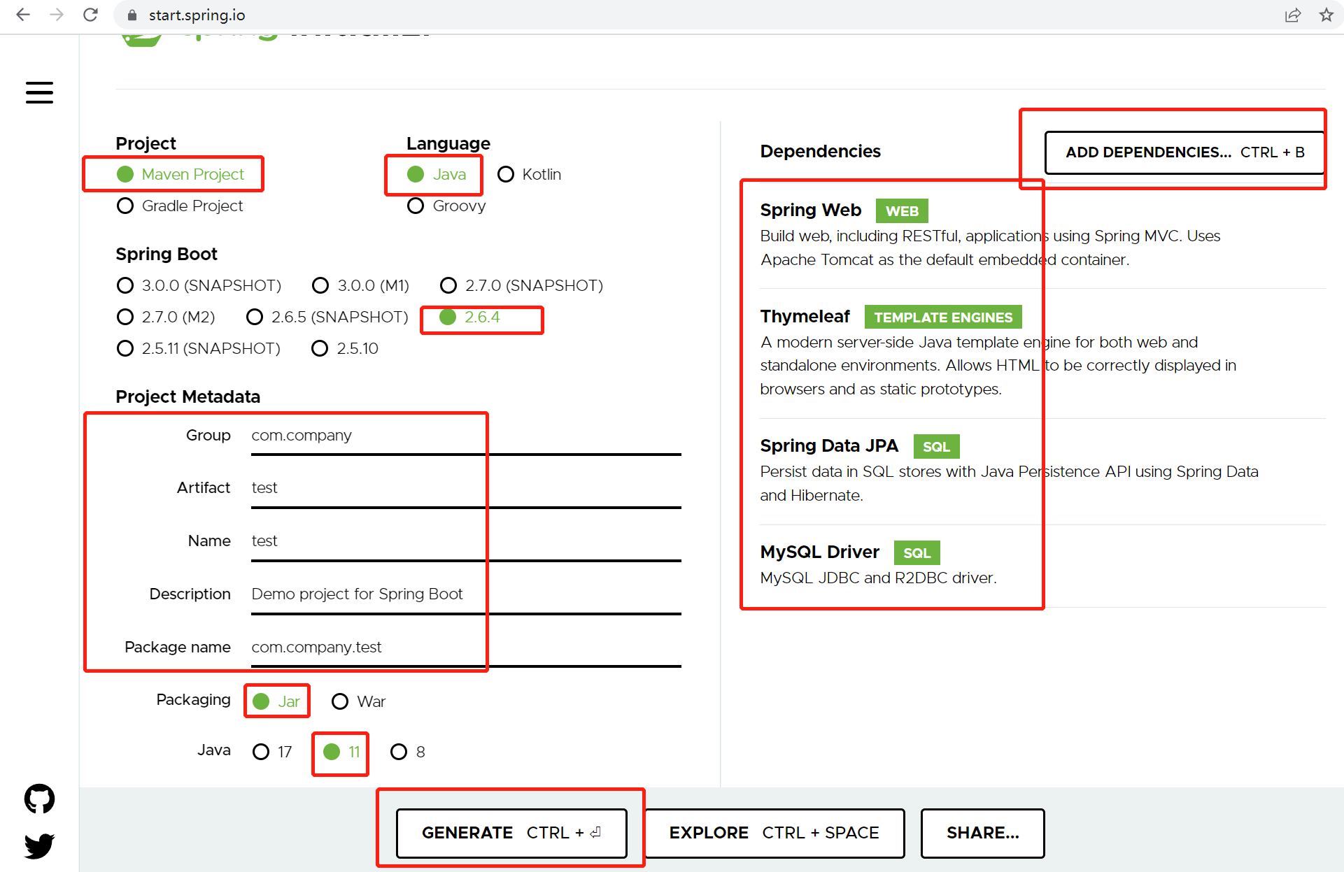 1) Follow the screenshot to check (green) and fill in the project information. After adding the pom dependency, click GENERATE and the test.zip package file will be automatically downloaded to the local area.