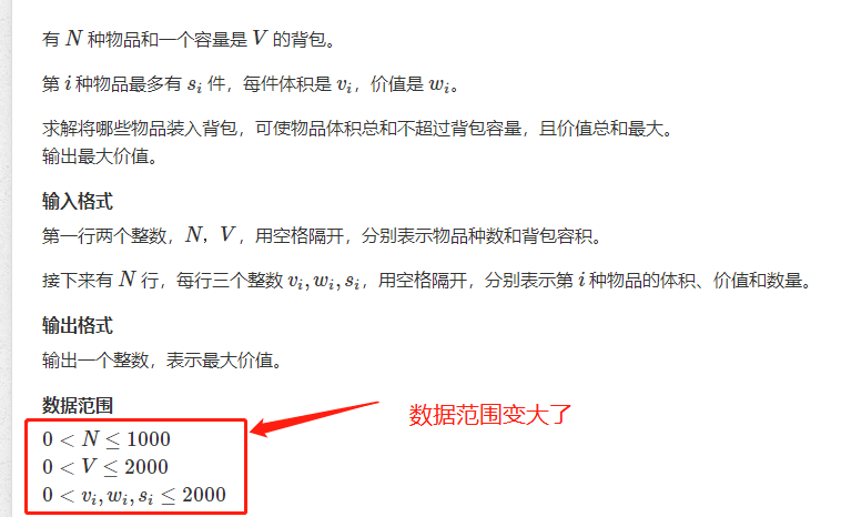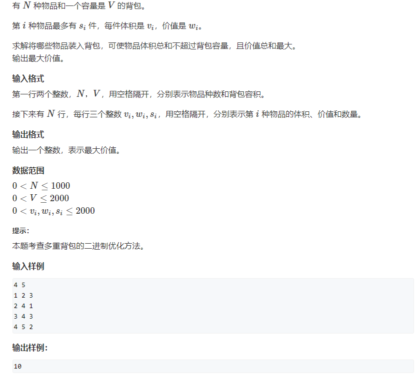 A mixed backpack problem It turned out to be overtime. Then I heard that multiple backpacks can be optimized. (1) Binary optimization Use s[i] to indicate that the item can be fetched s[i] times. It t...