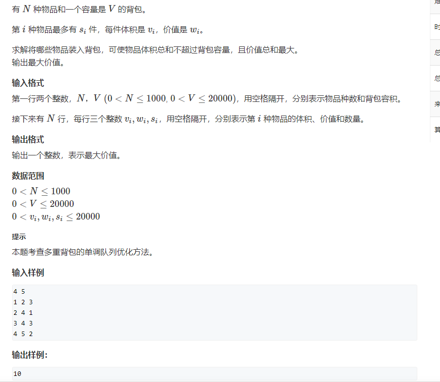 Problem Description There are N items, the volume of the first item isc[i]Valuew[i], The number of each item is limited,n[i] Now there is a backpack for V, please put in a number of items, so that the...