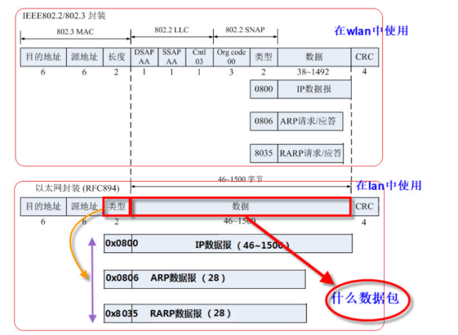 1. In order to be able to correctly parse out the upper layer data packets, each layer in the TCP/IP protocol stack is marked with some "protocol type", as detailed below