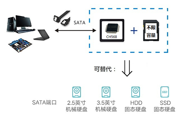 The SATA electronic disk solution based on the CH568 single-chip implementation uses CH568 as the disk drive and SD card as the storage medium. The serial SATA port is connected to a host computer and other hosts, and realizes the functions of local disk storage and system startup disk of the host.