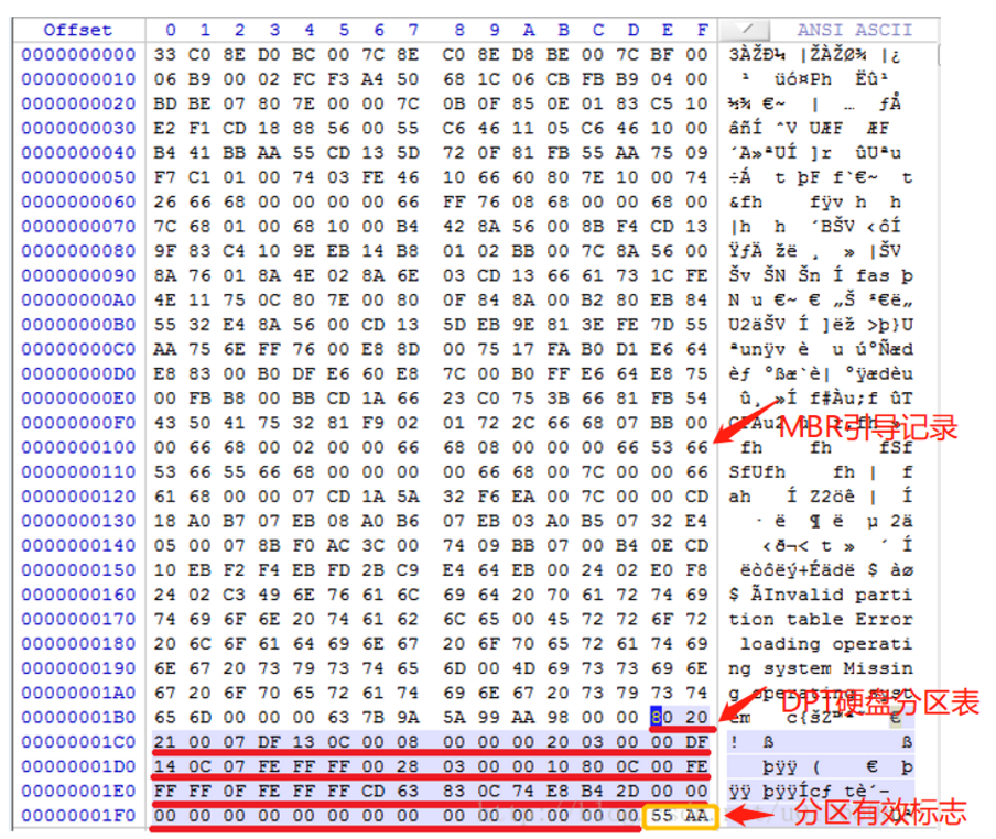 offset1BF-1C1 means CHS (Cylinder-Head-Sector, first find cylinder, then track, then find sector addressing method) start address 000101 (window OSLITTLE-ENDIAN (smallEndianness3. Low byte order storage, that is, the low-order byte is arranged at the low address end of the memory, and the high-order byte is arranged at the high address of the memory.